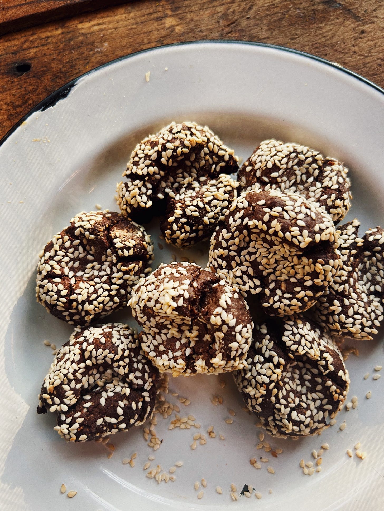 Mix well, form into balls, roll each ball in a bowl of sesame seeds.